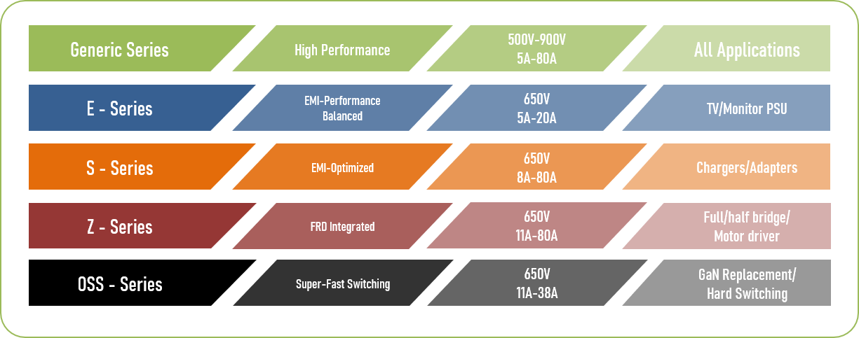 E系列(EMI平衡) | E系列產(chǎn)品綜合了Generic系列產(chǎn)品和S系列產(chǎn)品的特性,達(dá)到了開關(guān)速度和EMI的平衡,特別適用于TV電源、工業(yè)電源等領(lǐng)域。 |
